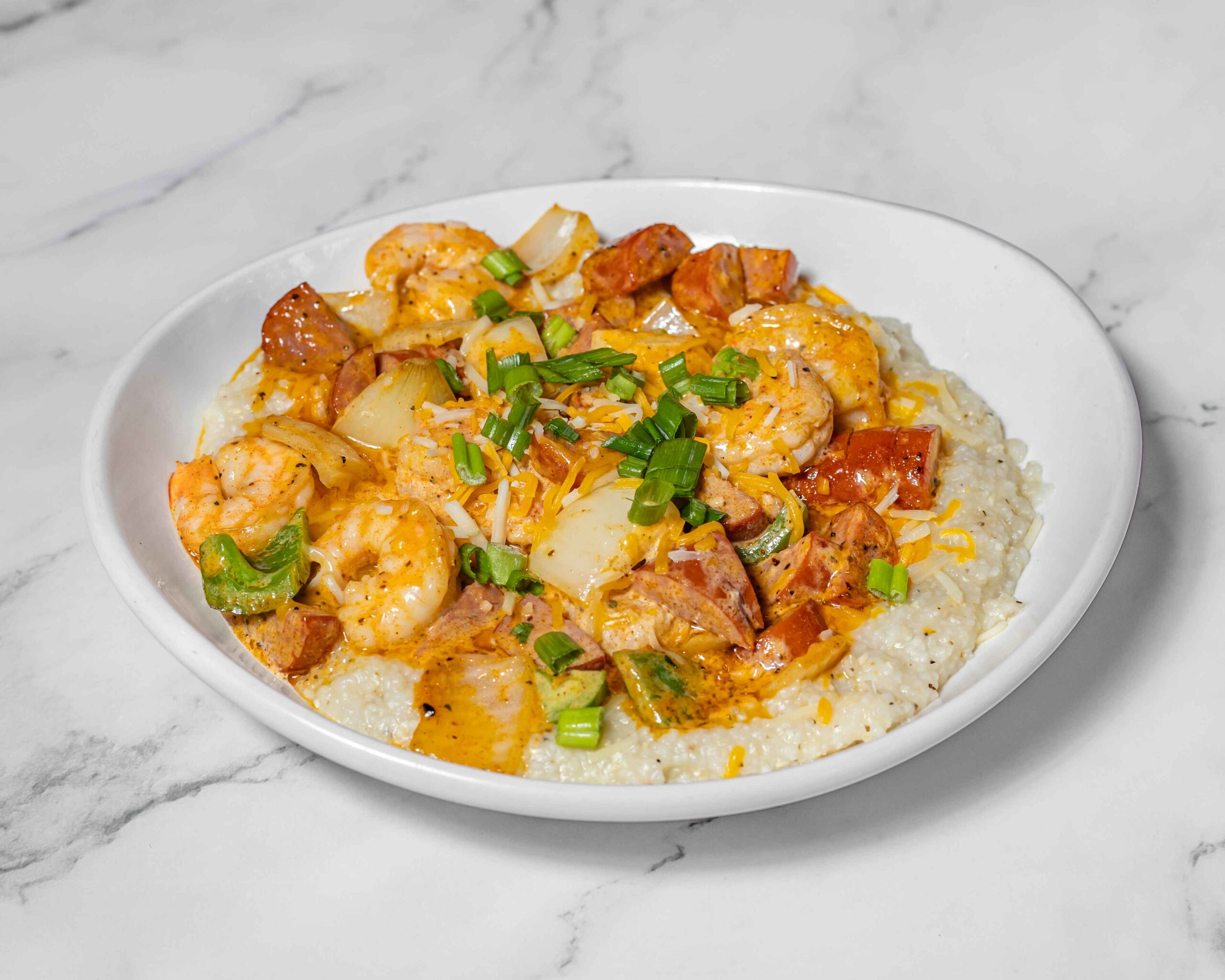 Creamy stone-ground grits crowned with tender sautéed shrimp, rich house-made sauce. Served with savory meats, sautéed peppers, and onions.